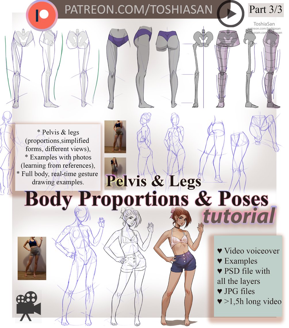 In this tutorial I will be talking about the proportions of a female body, focusing on the legs and pelvis. I will be giving lots of examples and walk you through the simplified forms!